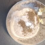 - Then, add 1 ½ Cup whole wheat flour, ½ tsp salt, 3 tsp carom seeds/ajwain, ¼ tsp baking powder, 1 tsp cardamom powder, 1 tsp fennel seeds powder in the Bowl.