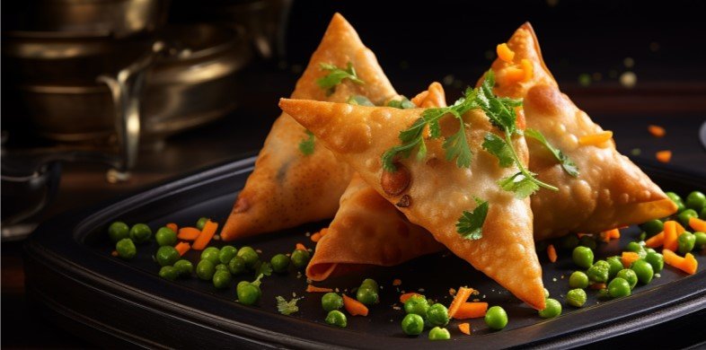 Samosas are a popular snack made with a deep-fried or baked pastry shell filled with a variety of fillings such as spiced potatoes, peas, or meat. They are often served with chutneys or sauces.