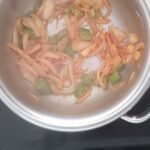 Then, sauté ½ onion petals and ½ cubed capsicum, and add ¼ tsp turmeric and ½ tsp chilli powder, as well as blended tomato-onion paste. Stir and mix.