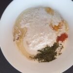 - Take 2 cups of all purpose flour/maida in a bowl and add ¼ tsp turmeric powder, ¼ tsp red chili powder, 1 tsp salt, pinch of black pepper powder, 1 tsp kasuri methi, pinch of asafoetida.